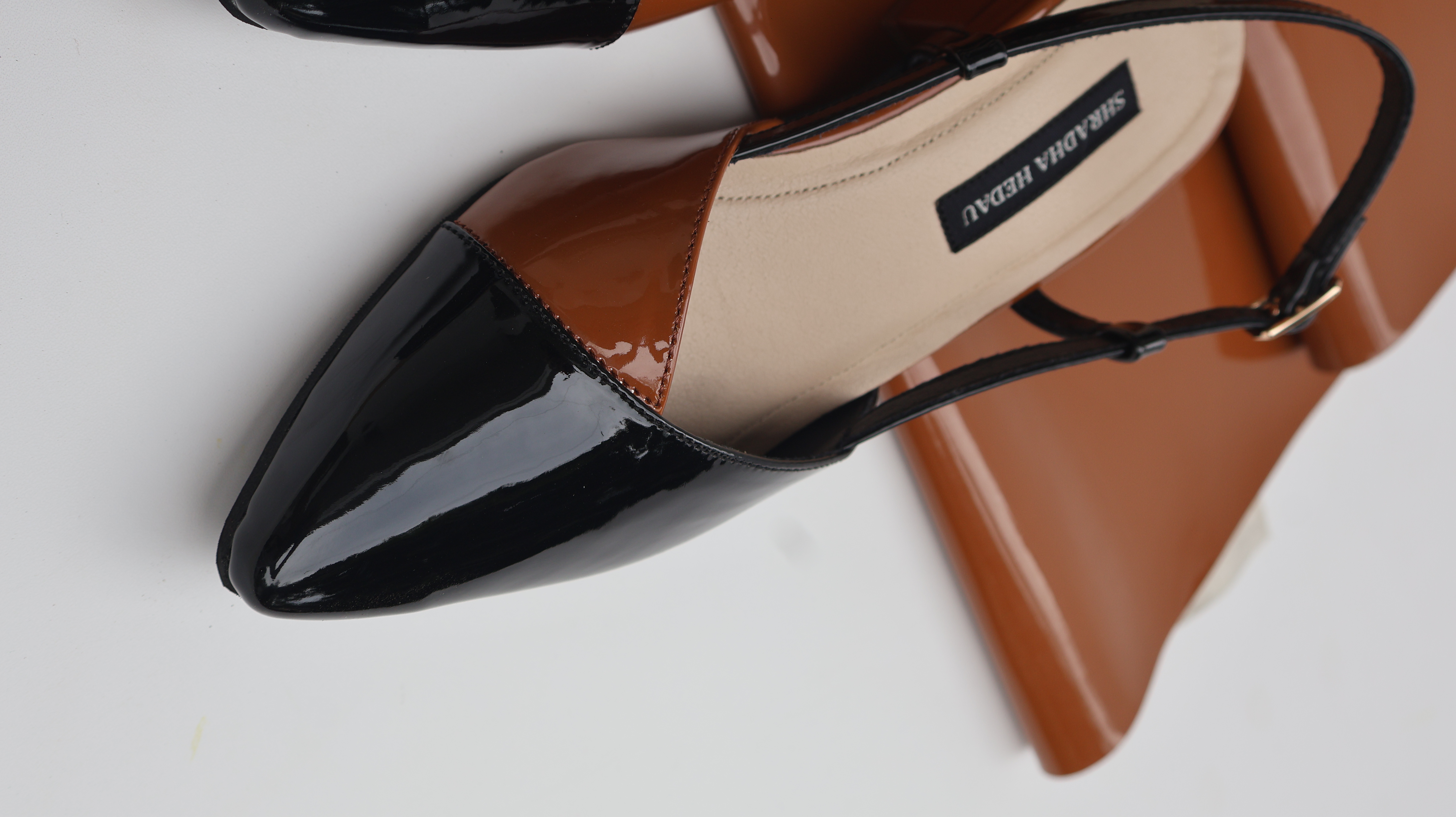 DESCRIPTION: Kiora brown formal heels with combination of patent leather .